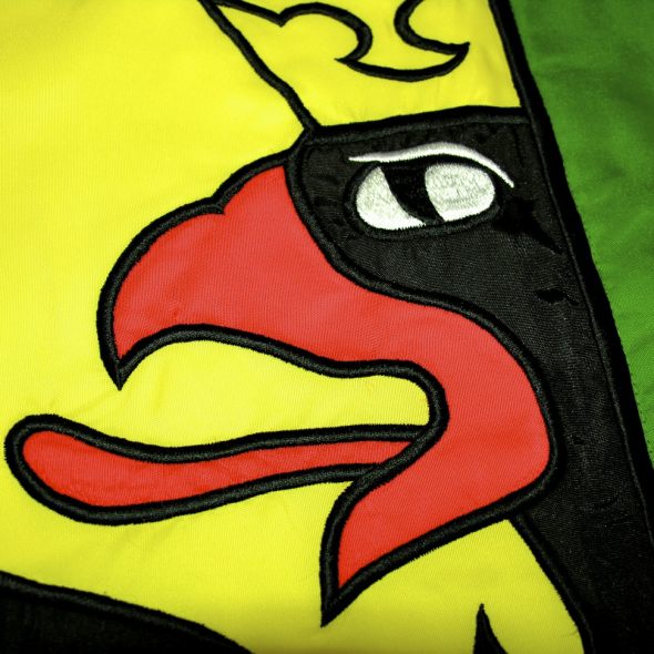 Venkovní vlajky vyšité aplikační výšivkou doporučujeme pro kusovou zakázku a jednodušší motivy vlajky. Aplikační výšivka je technika přivyšití předem nastřižených dílů na sebe. Prostřižením podkladového materiálu a seřízením vyšívacího stroje docílíme toho, že je motiv stejný z obou stran aplikované vlajky.