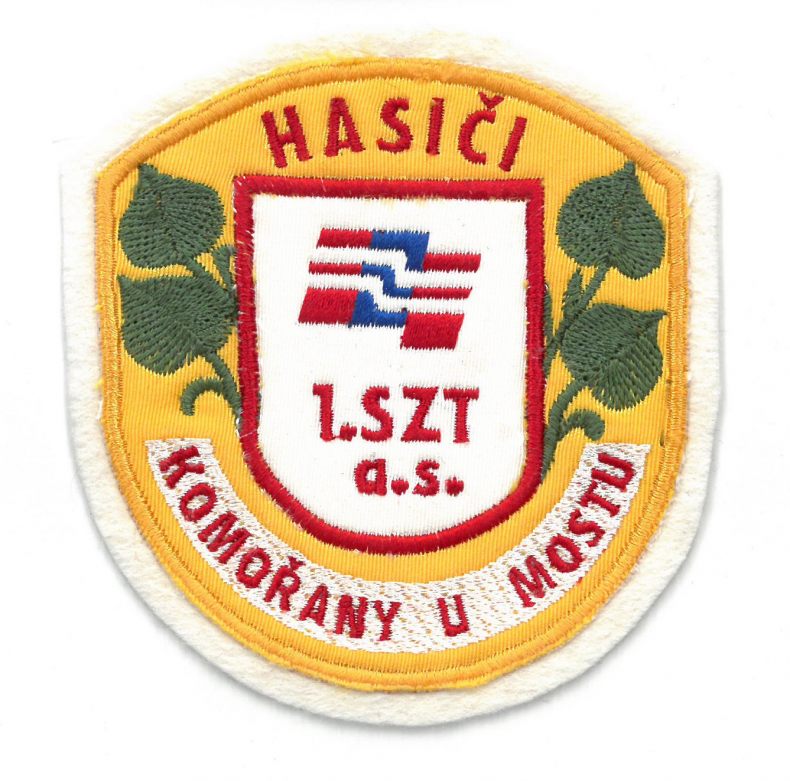 Hasičská nášivka pro hasiče 1. SZT a.s. z Komořan u Mostu. Provedení s filcovým podložením pro snadné našití.